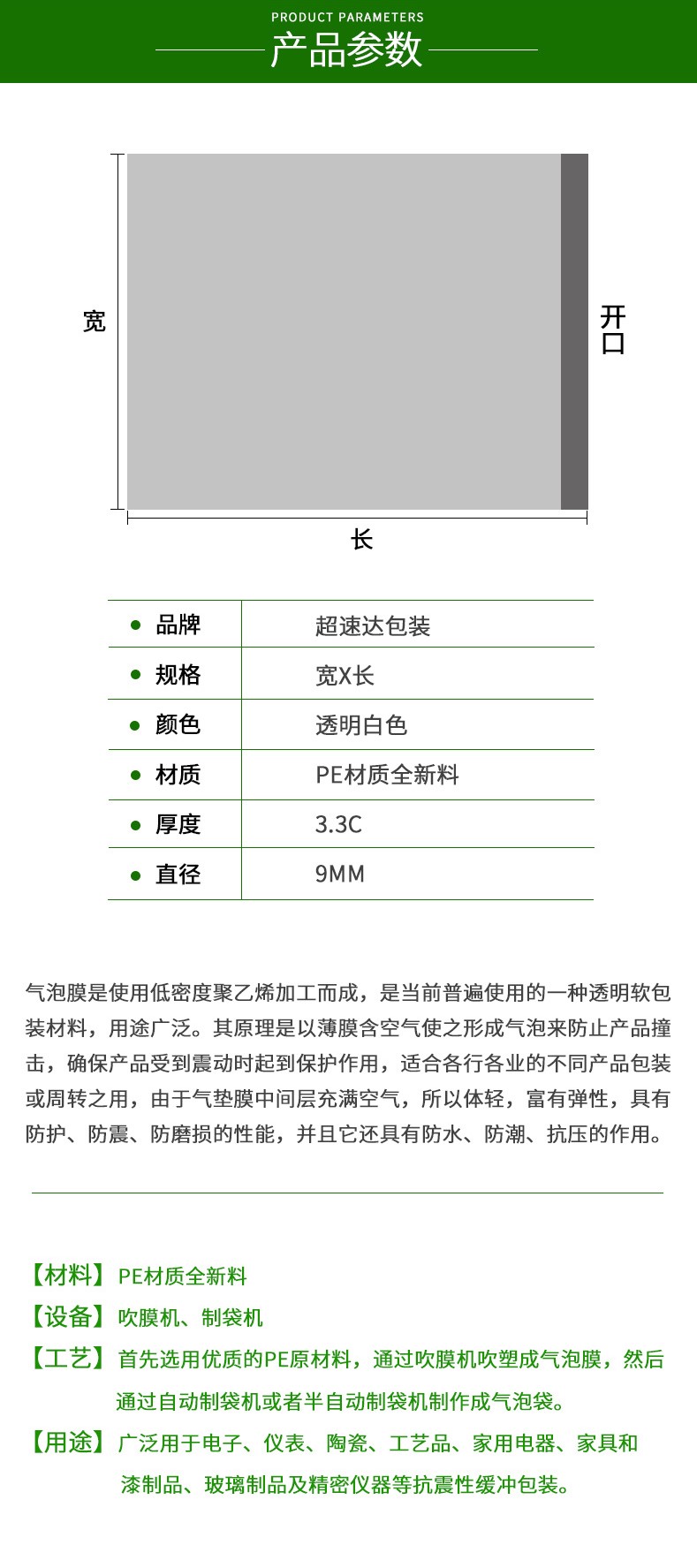 氣泡袋,又叫氣墊膜,氣珠膜,氣泡膜,氣泡紙,是采用LDPE低密度聚億烯樹脂加工而成。氣泡袋分為單面和雙面兩種,單面氣泡袋適宜保護自身重量較輕的產(chǎn)品,雙面氣泡袋防震力強適合體積較大較重之物品包裝。單、雙面氣泡袋均適合各行業(yè)產(chǎn)品的包裝如做袋、切片。單、雙面氣泡袋可設(shè)防靜電氣泡袋,以及不同顏色、印刷.還可復(fù)合其它材料增加保護性及美觀。主要產(chǎn)品有單面氣泡袋、雙面氣泡袋、加厚氣泡袋、紅色氣泡袋、白色氣泡袋、防靜電氣泡袋。